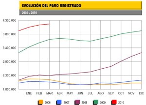 Fijaos en el gap que hay entre la línea que marca la evolución del paro en 2010 y las de 2006/2007: por muy buena que fuese la reforma laboral, necesitamos mucho más que eso para darle la vuelta a esta situación; no hay reforma laboral que recupere los niveles de empleo de un sector como el de la construcción que, por nuestro propio bien, no puede volver a la senda del crecimiento sin sentido en el que estaba y recordemos que la construcción arrastró en su ascenso vertiginoso a otros muchos sectores que, amarrados a su cola, han entrado también en caída libre en los últimos dos años.