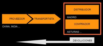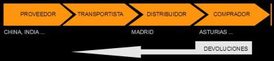 Ahí radica, a mi entender, la diferencia de fondo en el caso del e-commerce, hablamos de relaciones a tres aún cuando la negociación sigue estando entre dos; y en realidad, no sólo en el e-commerce, vemos cada vez más empresas que, con el ánimo de ajustar costes al máximo y simplificar su cadena de suministro, realizan envíos de sus proveedores directamente a su cliente final, también ahí hablamos de un juego a tres bandas. (De nuevo lo muestro gráficamente, con igual simpleza que en el caso anterior y por el mismo motivo … no hablamos hoy de cadenas de suministro)