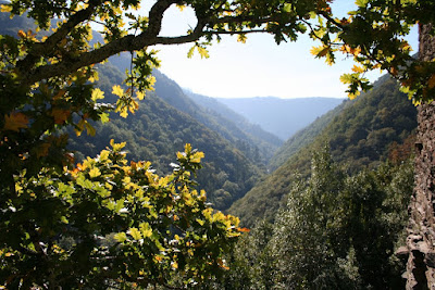 Y el final del camino … explosión de belleza y grandeza … subir el camino de pizarra y encontrar el reconstruido monasterio de Caaveiro, y entrar en él … y salir … y descubrir en ese preciso instante otra visión de las Fragas, las Fragas desde el aire … porque desde el Monasterio de Caaveiro no ves el camino recorrido, ves las copas de los árboles que te protegieron del sol en tu paseo, ves sólo a ratos el serpentear del Eume camino del océano … y lo ves finalmente nacer de las fragas para unirse al atlántico, al fondo el cielo y el mar…