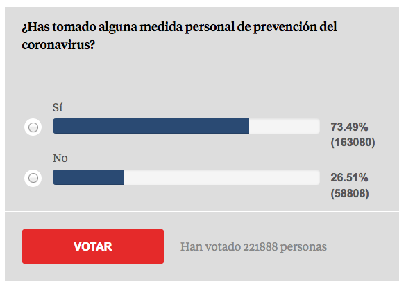 El 27 de febrero en una encuesta de La Vanguardia (que puedes consultar aquí) que respondieron más de 220.000 personas, más del 70% reconocía haber tomado medidas de prevención frente al coronavius, demostrado está que no eran alarmistas…