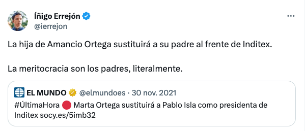 Recuerdo el día en que Errejón ironizó sobre esta frase, fue cuando Marta Ortega tomó la riendas de Inditex de manos de Pablo Isla, el alto directivo que había contratado su padre mientras ella se preparaba para lo lógico y natural, heredar a su padre; lo curioso del asunto es que Errejón tenía razón (mira, hasta rima…), la meritocracia son los padres, sí, siempre… claro que no por los motivos que él cree.