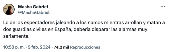 Lo de los espectadores jaleando a los narcos mientras arrollan y matan a dos guardias civiles en España, debería disparar las alarmas muy seriamente‘. La verdad es que las alarmas en España debieron dispararse cuando comenzó el blanqueamiento de la ETA y el hecho de que no lo hicieran es, probablemente, lo que nos ha traído hasta aquí. Eso y el estado general de Occidente, de los países más prósperos, de aquellos en los que sus ciudadanos han logrado una calidad de vida mejor, los más libres, los más democráticos… los que están perdiendo el norte (y los demás puntos cardinales).
