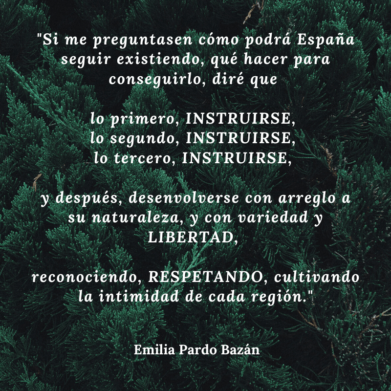 ‘Si me preguntasen cómo podrá España seguir existiendo, qué hacer para conseguirlo, diré que lo primero instruirse, lo segundo instruirse, lo tercero instruirse y después, desenvolverse con arreglo a su naturaleza y con variedad y libertad, reconociendo, respetando y cultivando la intimidad de cada región’. Emilia Pardo Bazán.