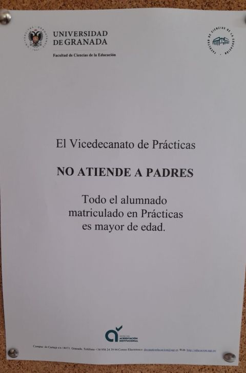 La cosa tiene su enjundia: por una parte se desdeña el papel de los padres en lo referente a la educación (todavía recuerdo a la señora ministra que soltó aquello de ‘los niños no son de los padres‘ negándonos así no solo el derecho a elegir el tipo de educación que queremos para nuestros hijos sino nuestro role como responsables últimos de esa educación); tras ese desprecio del papel de los padres en la educación de sus hijos vienen las quejas y lamentos de los profesores cuando los padres se meten en su terreno, como si no se dieran cuenta (honestamente creo que no se dan cuenta…) de que no respetar el papel de los padres, diluirlo, deja también a los padres perdidos, sin brújula, sabiéndose importantes en la educación de sus hijos pero sin reconocer límite alguno (al fin y al cabo el primer límite que se rebasó fue el de despreciarlos a ellos); y no hablo solo de los padres perdiendo los papeles en las reuniones de primaria o secundaria (socavando la autoridad del profesor en el aula) o llorándole a un profesor de bachillerato porque su hijo necesita más nota… a continuación podéis leer una nota del Vicedecanato de la Universidad de Granada: ‘El Vicedecanato de Prácticas NO ATIENDE A PADRES. Todo el alumnado matriculado en Prácticas es mayor de edad‘; no sé si el problema es que no asumimos que nuestros hijos ya son adultos (ese es, ciertamente, un problema clásico) o que consciente o inconscientemente asumimos que hemos fracasado en lo único en lo que no podíamos permitirnos fracasar: hemos acompañado a nuestros hijos en su vida infantil y juvenil pero no los hemos preparado para la vida adulta… y tratamos de poner parches al desastre actuando como si fuésemos sus abogados defensores… o algo así.